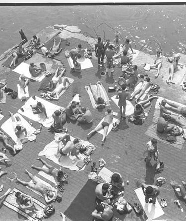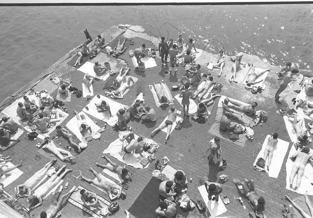 Sunbathers on the Hudson River piers near Christopher Street, c. 1970s. Before the epidemic, the piers symbolized queer freedom and intimacy; by the 1980s, the same waterfront became a place of grief and memorialization as the community gathered for vigils and farewells.