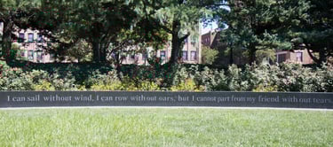 It was within this transformed landscape that the AIDS Memorial at Hudson River Park was dedicated in 2008 at Pier 49. The polished granite boulder, inscribed with the words, “I can sail without wind, I can row without oars, but I cannot part from my friend,” faces the Hudson River that had borne witness to decades of queer presence.⁵ The memorial draws its power from place: it recalls the waterfront’s role as a site of liberation, pleasure, and resistance, even as it anchors grief in stone. By situating AIDS remembrance in a geography once threatened with erasure, the memorial asserts that queer loss belongs to the civic memory of the city.