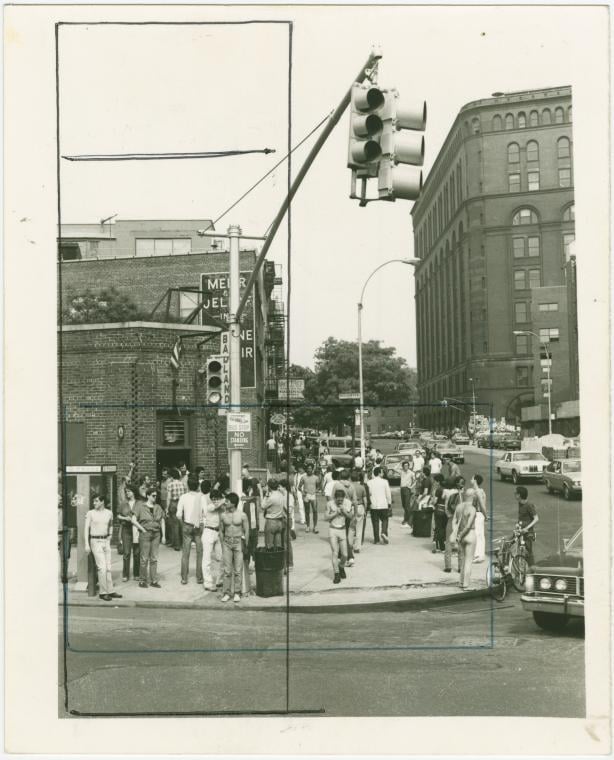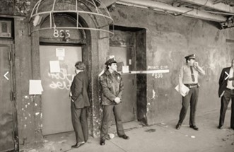 The closing of the Mineshaft, an after-hours sex club and filming location of the movie Cruising (1980). Nov. 7th, 1985. The decision to close venues like the Mine Shaft and St. Marks Baths, characterized by the media as symbols of unsafe behavior, sparked public debate about civil liberties versus public health. Photo by Rich Maiman. NYC LGBT Historic Sites Project. https://www.nyclgbtsites.org/site/mineshaft/