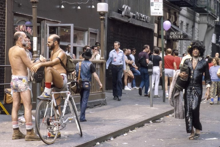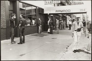 The Ramrod bar, West Street at Weehawken, c. 1978. Emerging in the 1950s, leather bars like the Ramrod, the Eagle, and the Mineshaft offered gay men a space to explore fetishism, BDSM, and sexual freedom. Dark, smokey, and unapologetically erotic, these bars flourished in industrial corners of the city even as they were targeted by police and condemned by the public. Artists such as Tom of Finland drew inspiration from their culture, which epitomized both defiance and visibility.