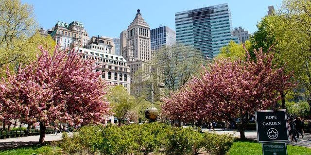 Hope Garden, Battery Park. Conceived as one of New York’s earliest AIDS memorials, the garden offered a contemplative green space without names, symbolizing remembrance and hope at the height of the epidemic. Photo courtesy of NYC Department of Parks & Recreation.