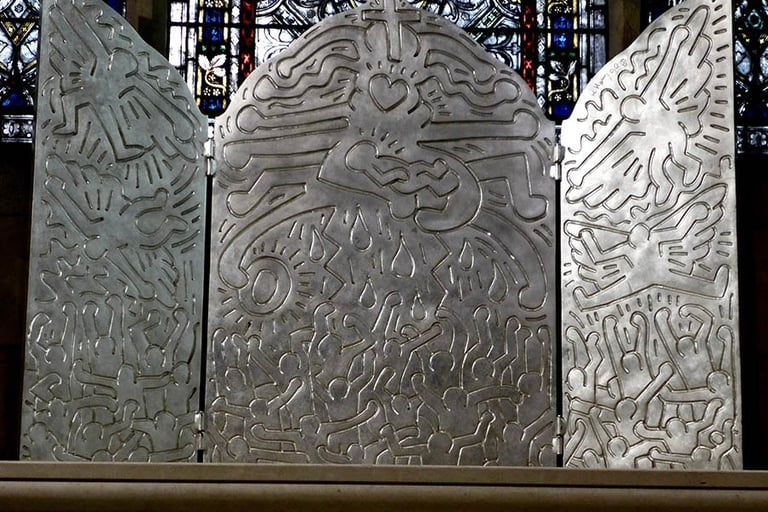 The Cathedral’s memorial presence grew in the years that followed. In 1990, only weeks before his death, Keith Haring completed "Life of Christ," a monumental triptych in bronze and white gold leaf.² Installed as an altarpiece in the Chapel of St. Saviour, just off the north transept, the work measures five by eight feet and weighs nearly 600 pounds. Its imagery, Christ flanked by angels and human figures carved in Haring’s energetic line, transforms the idiom of modern art into a religious icon. The piece became both Haring’s final testimony and one of the Cathedral’s most enduring AIDS memorials, standing where worshippers gather for prayer and reflection.