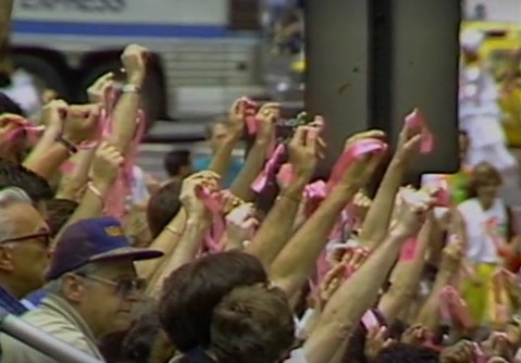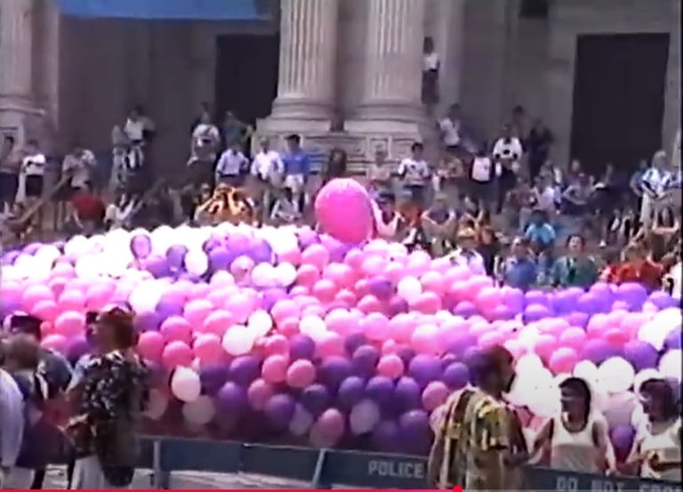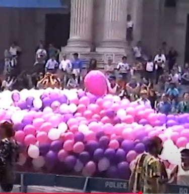 The Gay Cable News Network captured the Moment of Silence on the steps of the New York Public Library during the 20th anniversary of Stonewall, as the Pride march paused. The crowd lifted pink ribbons inscribed with the names of loved ones lost to AIDS as a deep-purple banner reading WE REMEMBER was unfurled across the Library’s facade. White, pink, and purple balloons floated upward, transforming grief into collective visibility. The Library—long a site of ACT UP protests and today home to one of the country’s largest LGBTQ and AIDS archives—was transformed into a stage for mourning and resistance, echoing the defiant spirit of Stonewall. Gay Cable Network, Lesbian and Gay Pride Parade, 1989, June 25, 1989. 00:10:14.020. Fales Library and Special Collections, NYU. https://findingaids.library.nyu.edu/fales/mss_231/video/5qftts9b/.