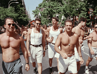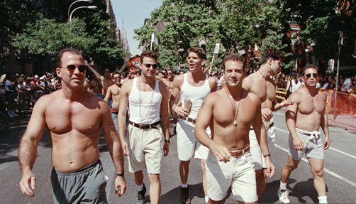By the 1990s, Pride parades increasingly featured the “Chelsea boy”—muscular, shirtless, and often white—as a visual emblem of queer vitality in the age of AIDS. This image projected survival and desirability but also narrowed who was seen, sidelining those most impacted by the epidemic, including people of color, women, trans people, and the visibly ill. Bob Adelman, Gay Pride Parade, New York City, 1994, photograph, Bob Adelman Estate, https://www.bobadelman.net/galleries/gay_pride_parade/.