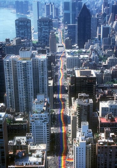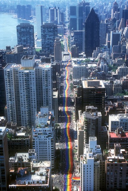Mile-Long Pride Flag, 1994. NYC. Photo by Rick Hicks. Courtesy of the Gilbert Baker Foundation. https://www.nyclgbtsites.org/site/gilbert-baker-raise-the-rainbow-workshop/https://www.nyclgbtsites.org/site/gilbert-baker-raise-the-rainbow-workshop/