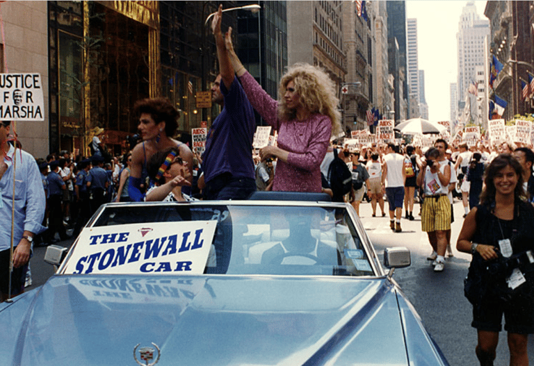 In the 1994 “Spirit of Stonewall March,” Queen Allyson Allante of the Imperial QUEENS & Kings of Greater New York (IQKNY) led veterans of the 1969 uprising in a procession that retraced the original Pride route. The Cadillac they rode carried a sign reading “Justice for Marsha,” honoring Marsha P. Johnson and underscoring the unresolved struggles around gender, race, and violence in queer history. Behind them, ACT UP activists and the gleaming façade of Trump Tower formed a striking backdrop, contrasting grassroots defiance with the symbols of political neglect and corporate power. The moment captured how Stonewall 25 was both commemoration and confrontation, weaving together memory, activism, and resistance.