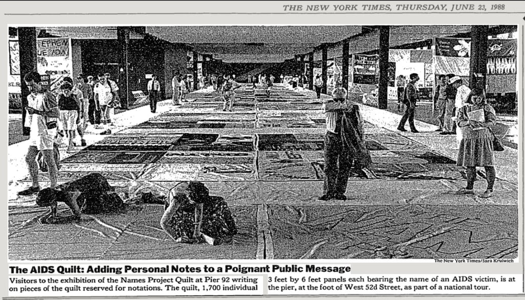 David W. Dunlap, “Quilt Unfolds Painful Story of AIDS,” New York Times, June 20, 1988, Sec. B, p. 3.