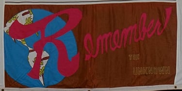 Set against a somber map of the Western Hemisphere, this panel bears only the words “Remember the Unknown.” It honors those lost to AIDS whose names were never recorded, whose lives went unclaimed or unrecognized. In its stark simplicity, the panel transforms absence into testimony, insisting that even those rendered invisible by stigma or circumstance must not be forgotten. Block # 1258 (05). National AIDS Memorial. “AIDS Memorial Quilt.” Accessed April 23, 2025. https://www.aidsmemorial.org/quilt.