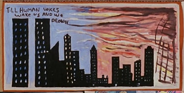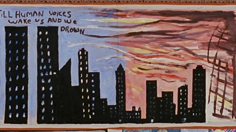 This haunting line from T. S. Eliot’s The Love Song of J. Alfred Prufrock appears on a stark, enigmatic panel. Without images or names, it conveys the weight of silence and foreboding that surrounded the epidemic. Its words read like a warning and a lament, evoking a city sleepwalking through catastrophe and the urgency of voices that were too often ignored until it was too late. National AIDS Memorial. “AIDS Memorial Quilt.” Accessed April 23, 2025. https://www.aidsmemorial.org/quilt