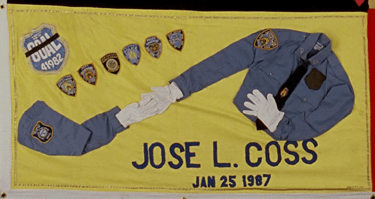 Two police uniforms stitched hand in hand, marked with the insignia of the Gay Officers Action League. A quiet but powerful gesture of love, vulnerability, and solidarity within an institution often hostile to LGBTQ+ lives. . Block # 891 (08). National AIDS Memorial. “AIDS Memorial Quilt.” Accessed April 23, 2025. https://www.aidsmemorial.org/quilt.