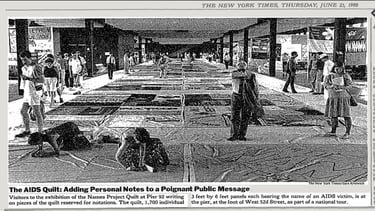 ³ David W. Dunlap, “Quilt Unfolds Painful Story of AIDS,” New York Times, June 20, 1988, Sec. B, p. 3.