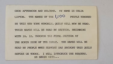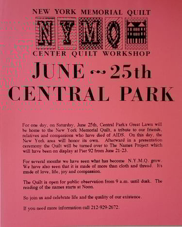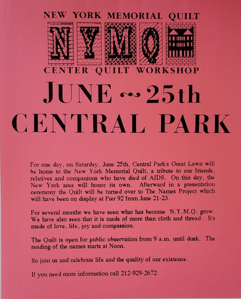 “NEW YORK MEMORIAL QUILT … For one day, Central Park’s Great Lawn will be home to the New York Memorial Quilt, a tribute to our friends, relatives, and companions who have died of AIDS. On this day, the New York area will honor its own… For several months we have seen what has become NYMQ [New York Memorial Quilt] grow. We have also seen that it is made of more than cloth and thread. It's made of love, life, joy and compassion... Join us and celebrate life and the quality of our existence.”