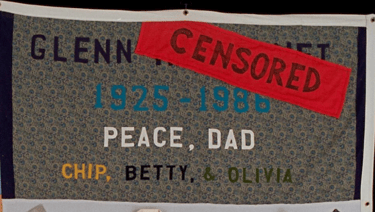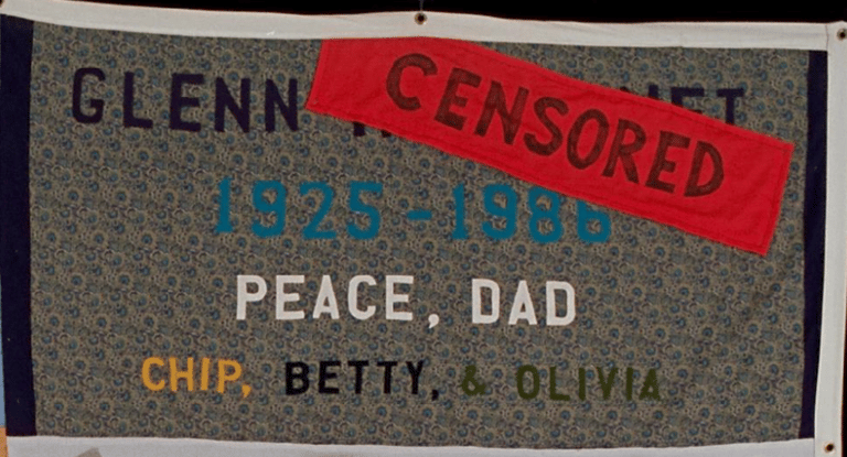 To submit a panel sometimes meant outing someone after death. Families often resisted AIDS-related symbols, erased same-sex partners, or negotiated compromises. One such example is the panel for Glenn [Censored], lovingly stitched by his children. They withheld his surname but refused silence, creating a tribute that honored him without exposing what he had kept private in life. His panel reveals how remembrance often required difficult choices, balancing love, secrecy, and stigma. Quilt panel for Glenn [Censored]. Block # 639 (01). National AIDS Memorial. “AIDS Memorial Quilt.” Accessed April 23, 2025. https://www.aidsmemorial.org/quilt.
