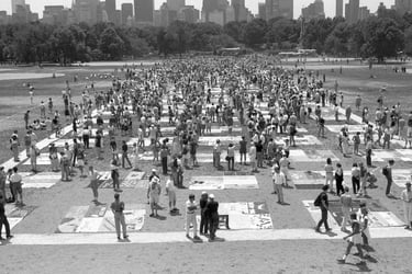 Against this backdrop, the Quilt remade the space. On June 25, fabric stitched by thousands of hands covered the Dustbowl, turning a neglected field into sacred ground. The unveiling was more than symbolic. In a city where the epidemic’s toll was staggering and government response painfully slow, the Quilt asserted its presence. It transformed the heart of New York into a visible field of memory, grief, and resilience. Some were drawn intentionally by the flyers; others stumbled upon the display by chance. On one side of the Lawn, families picnicked and tossed frisbees. On another, mourners walked in silence among the panels. The juxtaposition captured the city’s fractured response to AIDS: grief and indifference, visibility and disregard, existing side by side
