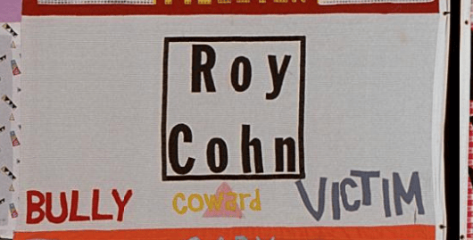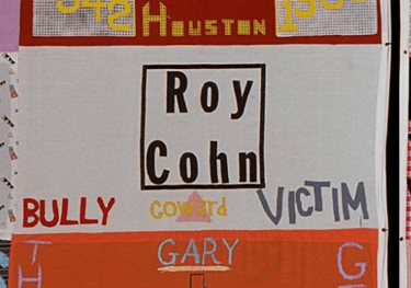 Some panels broke away from the Quilt’s usual language of love and mourning. They did not simply grieve; they accused. One of the most striking examples is the panel for Roy Cohn, the powerful lawyer who spent his career persecuting queer people during the McCarthy era, advised Donald Trump, and fought against AIDS policy even as he lived and died with the disease. His panel displayed a pink triangle with the words “bully,” “coward,” and “victim.” Unlike the panels that tenderly remembered sons, lovers, or friends, this one refused forgiveness. Block # 104 (04) National AIDS Memorial. “AIDS Memorial Quilt.” Accessed April 23, 2025. https://www.aidsmemorial.org/quilt.