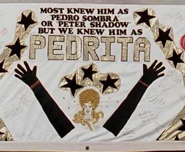 Friends honored Pedro through his drag persona, Pedrita, adorning the panel with gloves and handwritten messages. It captures the joy and resilience of queer nightlife and the chosen family that accompanies it. Block # 578 (04). National AIDS Memorial. “AIDS Memorial Quilt.” Accessed April 23, 2025. https://www.aidsmemorial.org/quilt.