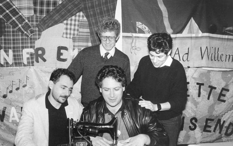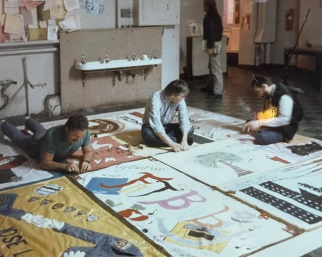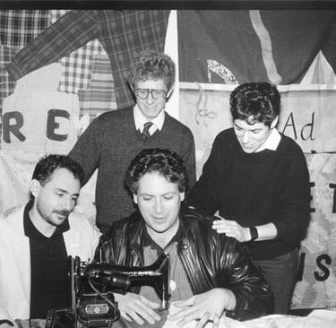 Mark Johnson and two unnamed volunteers stitch panels into blocks in the lobby of the Lesbian and Gay Community Services Center. NYC, 1988. Courtesy of Mark Johnson from his private collection.