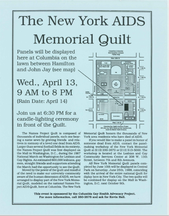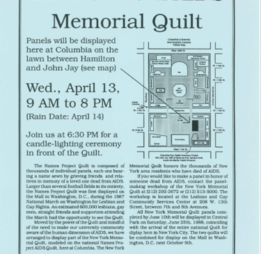 Flyer for the AIDS Quilt display at Columbia University, 1988. James Burke Papers, 1970–1996, Collection 44, LGBT Community Center National History Archive, processed January 30, 1996.