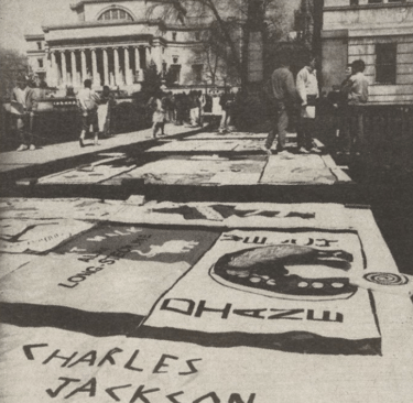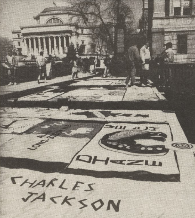 The AIDS Quilt is displayed on Hamilton Lawn at Columbia University. Columbia Daily Spectator, April 14, 1988. Accessed April 3, 2025. https://ghaparchive.health.columbia.edu/sites/default/files/content/Spectator/1988/AIDS%20quilt%20on%20Hamilton%20lawn%20honors%20New%20Yorkers%20who%20died%20of%20the%20disease%2014%20November%201988.pdf.