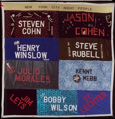 This block commemorates the world of clubs, discos, and dance floors that defined queer New York. It remembers not only the patrons but also the bartenders, DJs, and promoters who built spaces of freedom and community. Names of venues like The Saint, Limelight, and Studio 54 appear alongside those who animated them. Among the most notable is Steve Rubell, co-owner of Studio 54, whose velvet-rope empire came to symbolize glamour, excess, and queer visibility in 1970s Manhattan. His presence on the Quilt, stitched beside nightlife workers and everyday revelers, reminds us that AIDS devastated both the famous and the anonymous, the celebrated and the unseen. Together, these panels preserve nightlife as more than entertainment—it was a vital arena of queer belonging, expression, and survival. Block # 1667. “AIDS Memorial Quilt.” Accessed April 23, 2025. https://www.aidsmemorial.org/quilt.