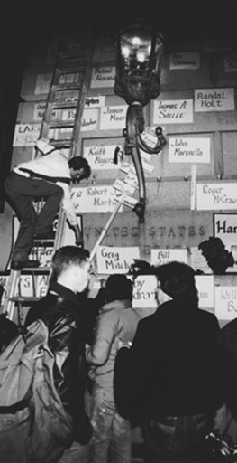 Mourners Tape Names to the Façade of the Federal Building in San Francisco, November 27, 1985. Photograph. National Library of Medicine. Against the Odds: Making a Difference in Global Health. https://www.nlm.nih.gov/exhibition/againsttheodds/exhibit/action_on_aids/AIDS_memorial_quilt.html.