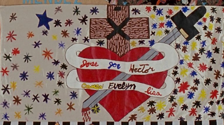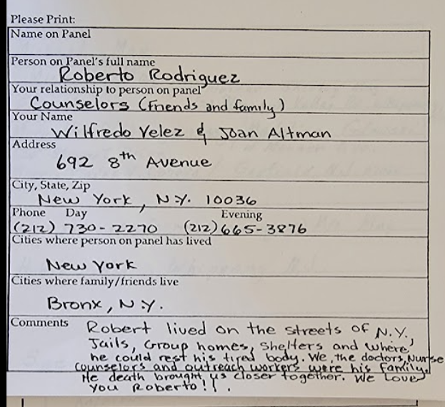 Roberto Rodriguez, a homeless man who cycled through hospitals, shelters, and jails, had no family left to grieve him. His panel was made by the outreach workers who had become his chosen family. “Robert lived on the streets of N.Y. jails, group homes, where he could rest his tired body. We, the doctors, nurses, counselors, and outreach workers, were his family,” they wrote. “His death brought us closer together."