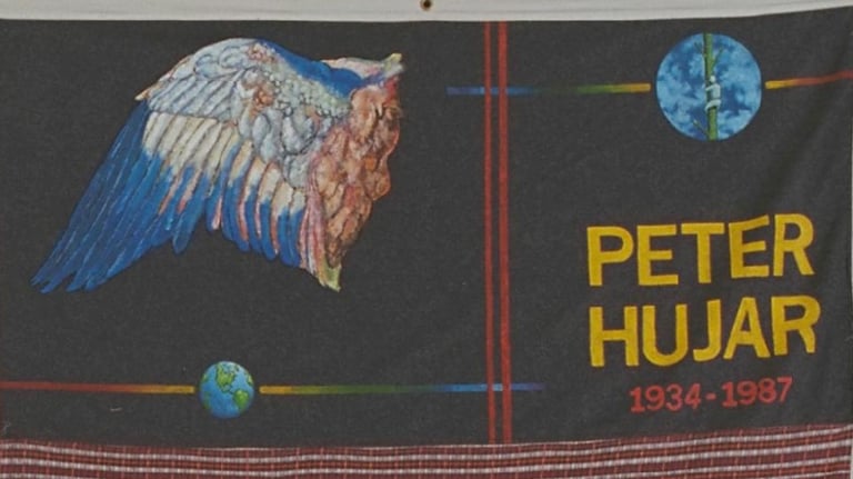 Artist David Wojnarowicz crafted this panel to honor his friend and mentor, photographer Peter Hujar. One of the most influential figures in New York’s downtown art scene, Wojnarowicz transformed his grief into art, stitching memory and protest into fabric. The panel stands as both a tribute to Hujar’s vision and an extension of Wojnarowicz’s own artistic legacy. Block # 854 (05). “AIDS Memorial Quilt.” Accessed April 23, 2025. https://www.aidsmemorial.org/quilt.