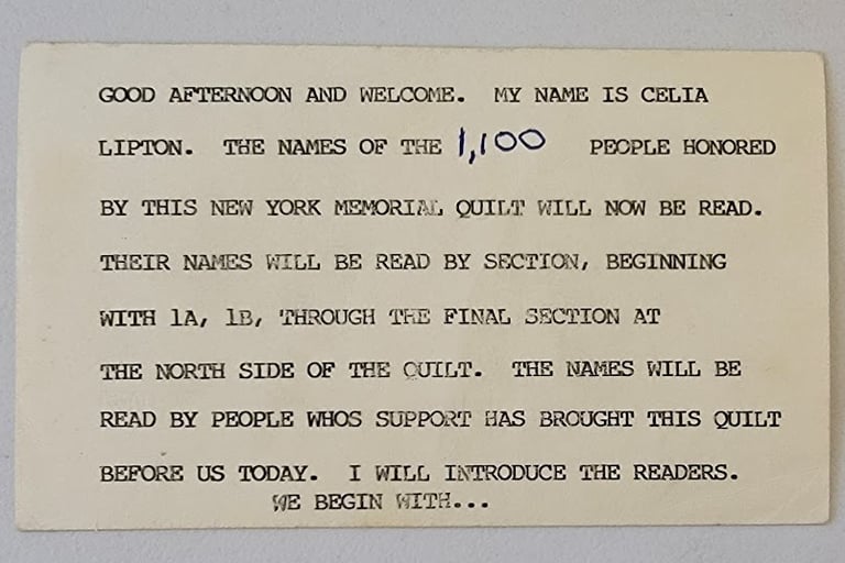 The 1988 display of the AIDS Memorial Quilt in Central Park survives today in fragments: news photographs, flyers distributed during Pride, press clippings, and the memorial forms preserved in the LGBT Community Center Archive. Most crucially, the meticulous record-keeping of Jim Burke, a volunteer and co-coordinator of the New York Quilt Workshop, makes it possible to reconstruct the day with unusual precision. Burke saved everything—letters, schedules, budgets, and memorial forms—ensuring that this fleeting event left behind a detailed archive. Without his diligence, much of the lived texture of the New York display would have disappeared.