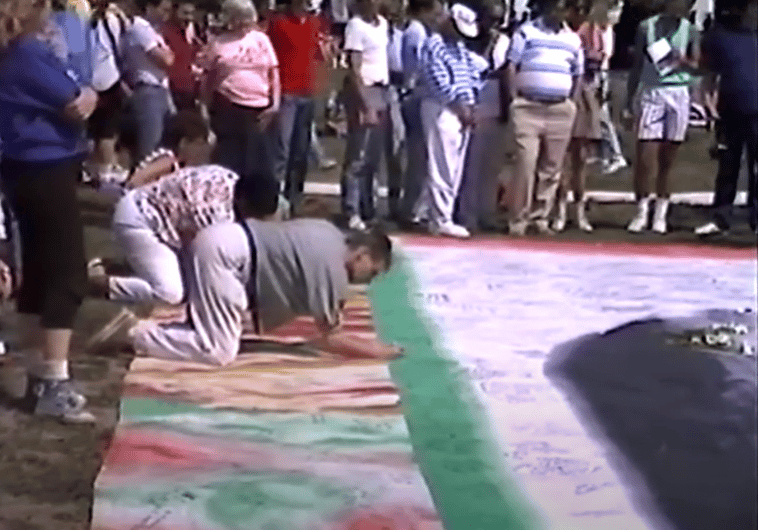 Visitors write messages on the hand-dyed cotton donated by Japanese artist Hiroshi Saito. Central Park NYC – June 25, 1988, YouTube video, 11:13, posted by “Peter Carley,” May 15, 2020, https://www.youtube.com/watch?v=cAb7c3qNPEE&t=526s.