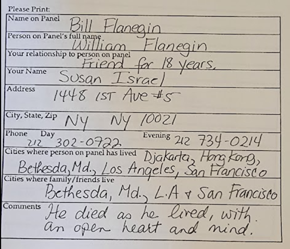 Panel for Bill Flanegin includes a note from a friend of eighteen years, who wrote that Bill “died as he lived, with an open heart and mind.” In foregrounding enduring friendship and emotional intimacy, the tribute resists normative ideas of legacy rooted in biology or conventional family.